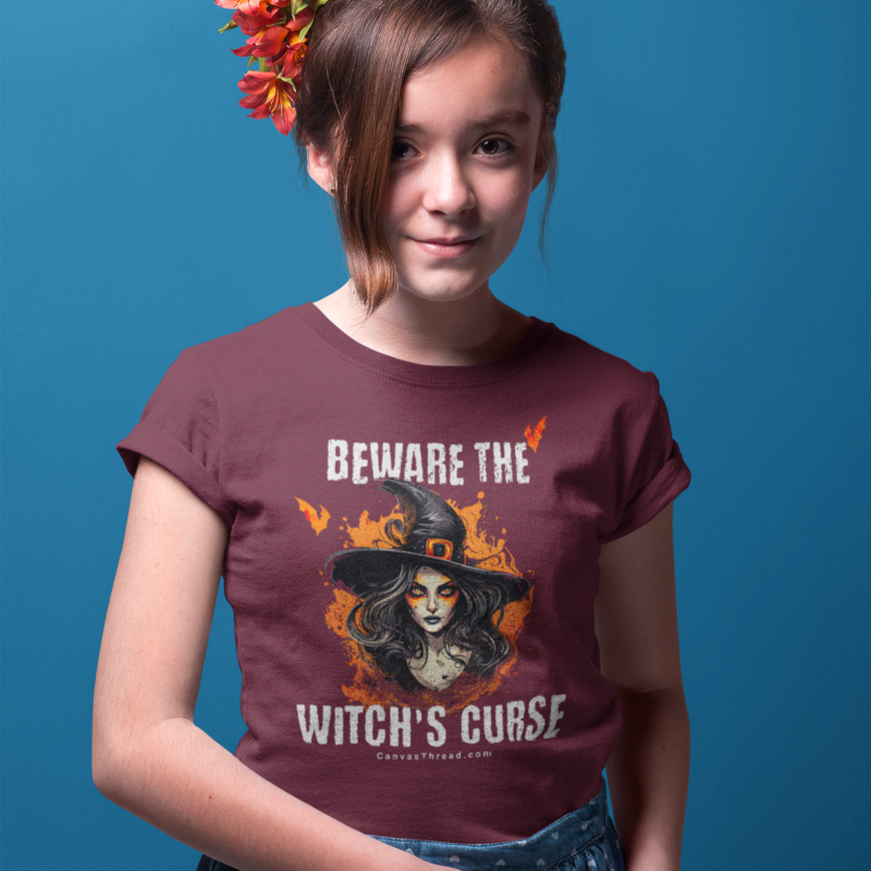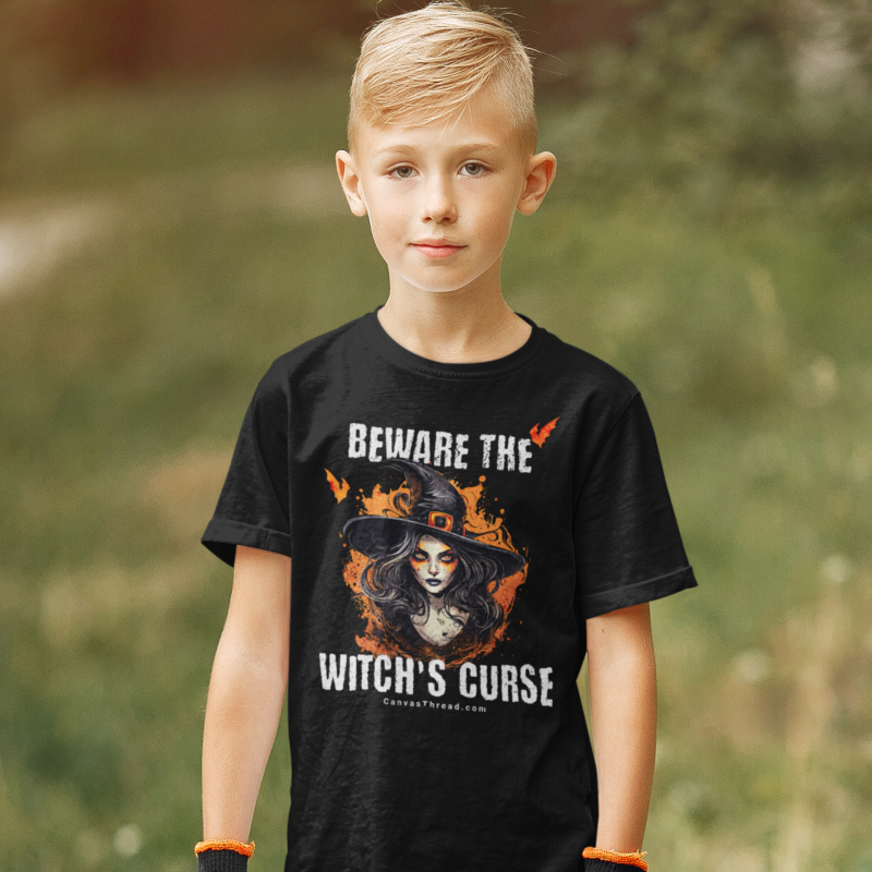 A spooky Halloween tee your kid will love! 👻 This “Beware the Witch’s Curse” youth T-shirt features a dramatic witch design that’s perfect for trick-or-treating, costume parties, or showing off Halloween spirit all season long. Made from soft, lightweight fabric, it offers a relaxed unisex fit that’s perfect for both boys and girls—comfortable for everyday wear and durable enough to last beyond the spooky season.